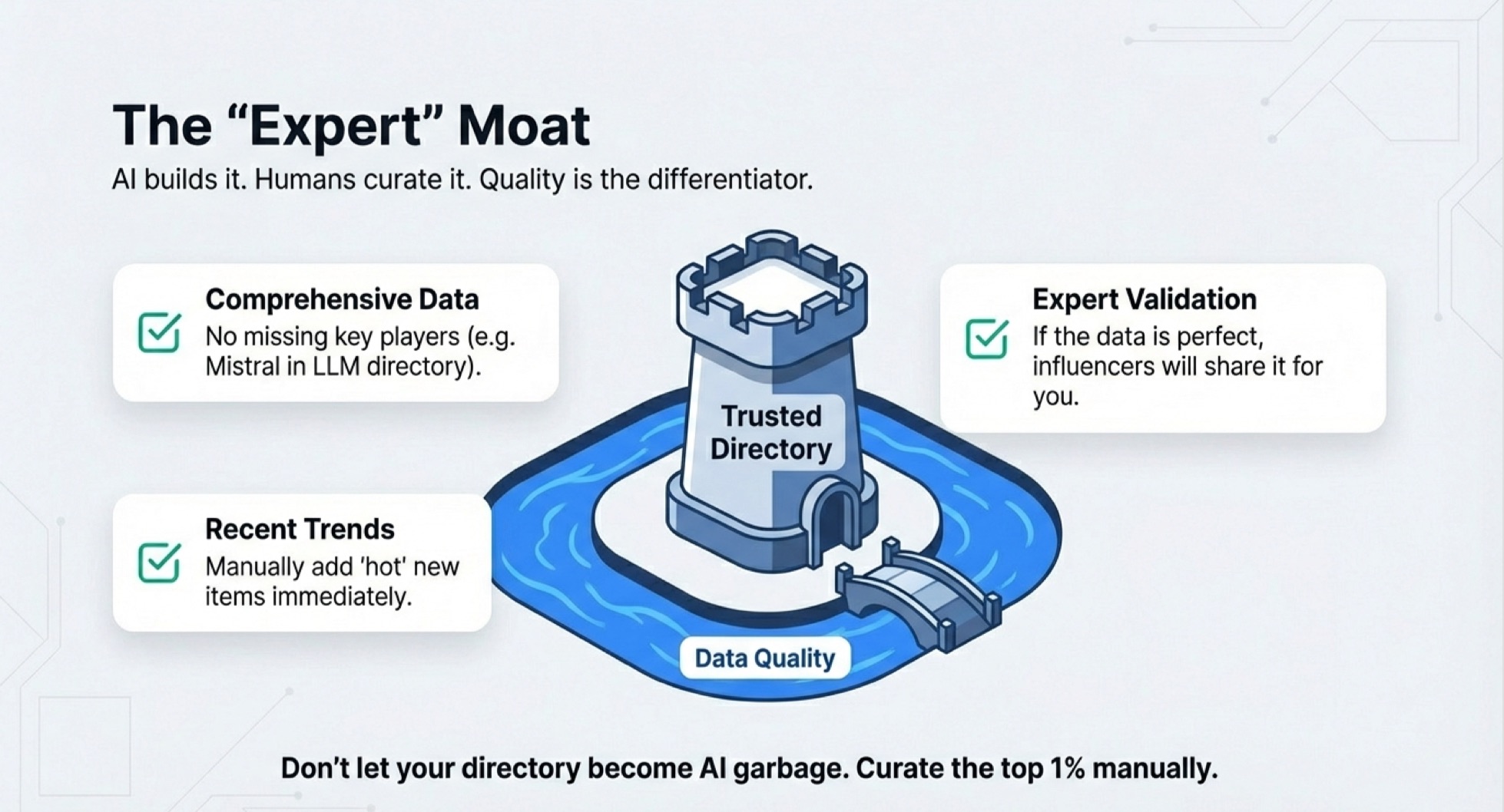 To win long-term, you must be comprehensive. You cannot have "missing key players." If you have an LLM directory and you don't list Mistral (the French AI model), your directory loses credibility.