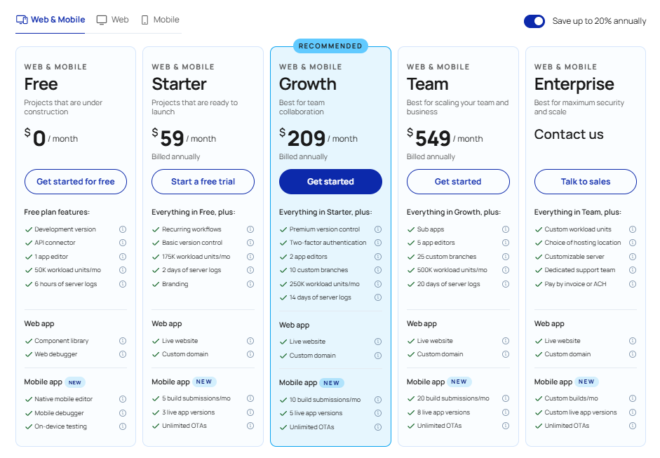 Bubble’s pricing as of 2025 typically falls into these tiers: