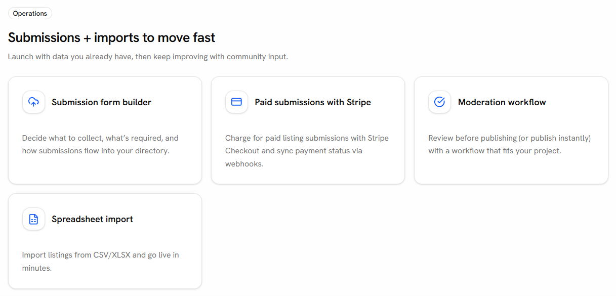 From idea to directory: collect submissions, import spreadsheets, customize fields, and publish on your domain