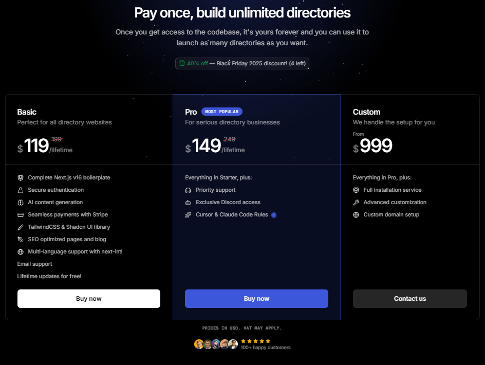 Get a complete, customizable Next.js directory template with built-in payments, SEO, and AI content — pay once, launch unlimited directories.