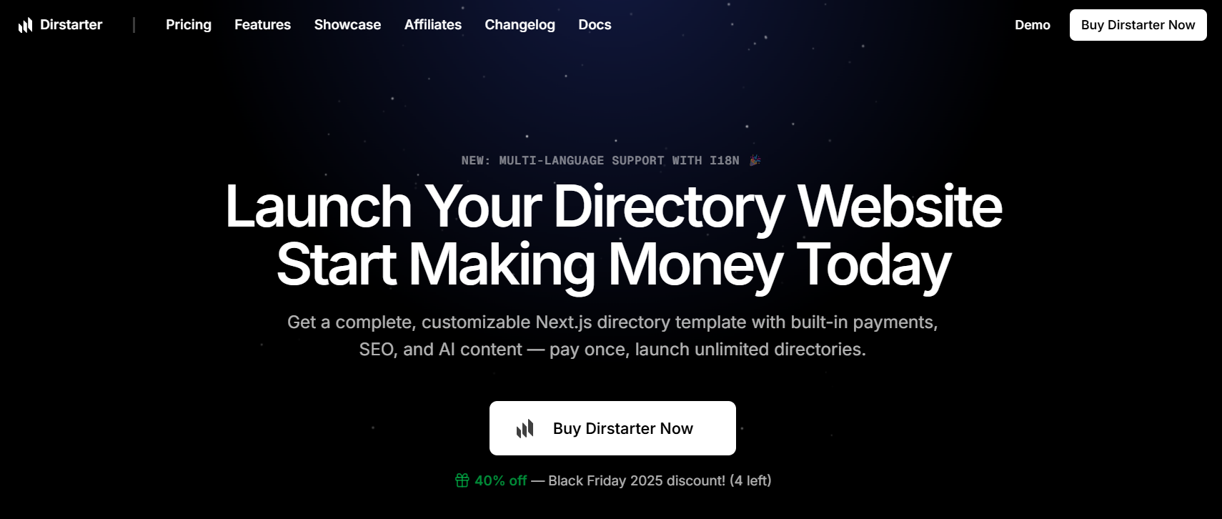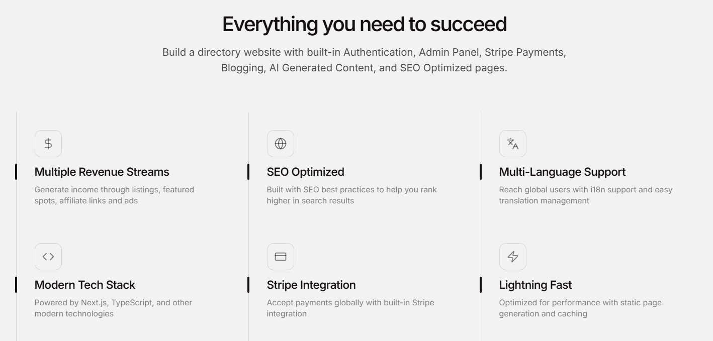 Get a complete, customizable Next.js directory template with built-in payments, SEO, and AI content — pay once, launch unlimited directories.