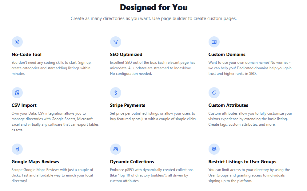 The platform is optimized for both ease of use and scalability, which makes it perfect for solopreneurs looking to set up a directory to make money online. It’s designed to help you create directories, grow them, and monetize them all in one place, without having to become a web developer in the process.
