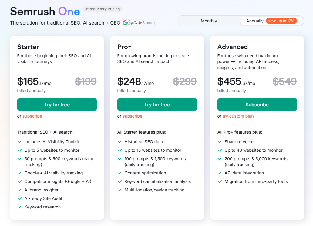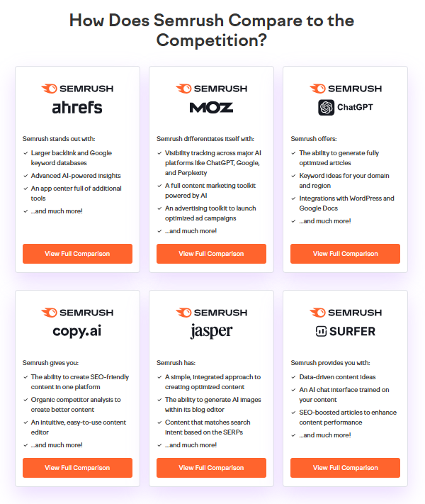 Does SEMrush include AI tools? Yes, including AI-assisted content outlines and SEO scoring.