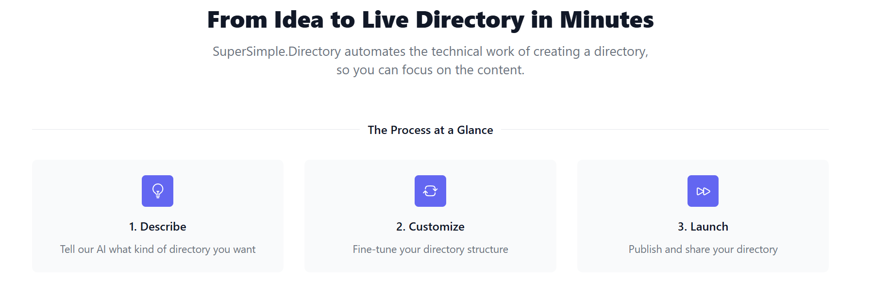 SuperSimple.Directory is a no-code, AI-assisted directory builder designed for solopreneurs who want to launch a directory site quickly without sacrificing long-term SEO or monetization potential. It removes the usual friction of directory setup—schema planning, data entry, and structure—while still giving you a foundation that can rank on Google and grow into a real asset. If your goal is to build a directory that makes money instead of just looking nice, this tool is worth a serious look.