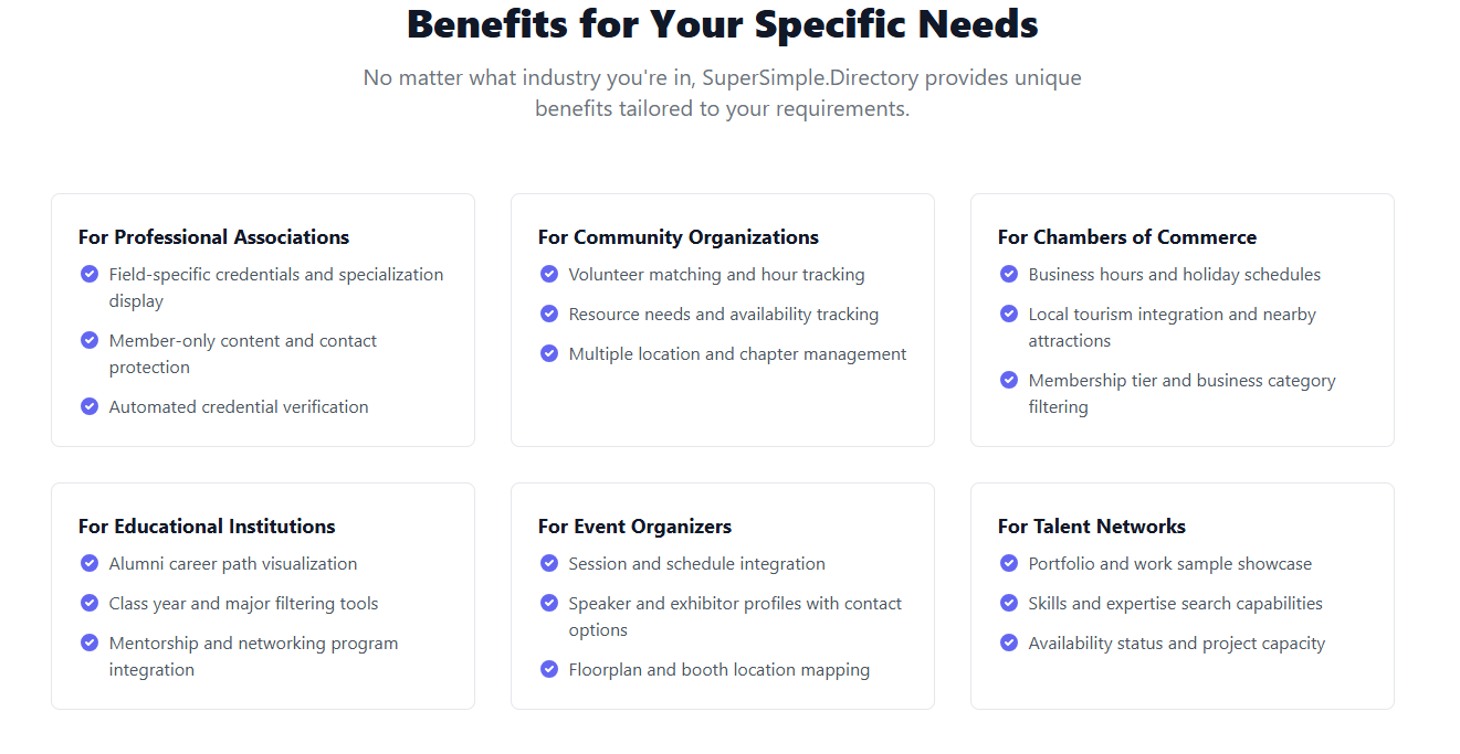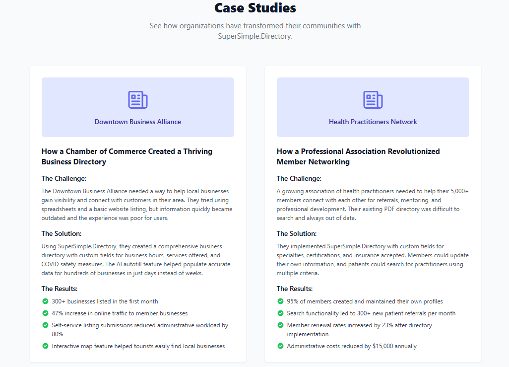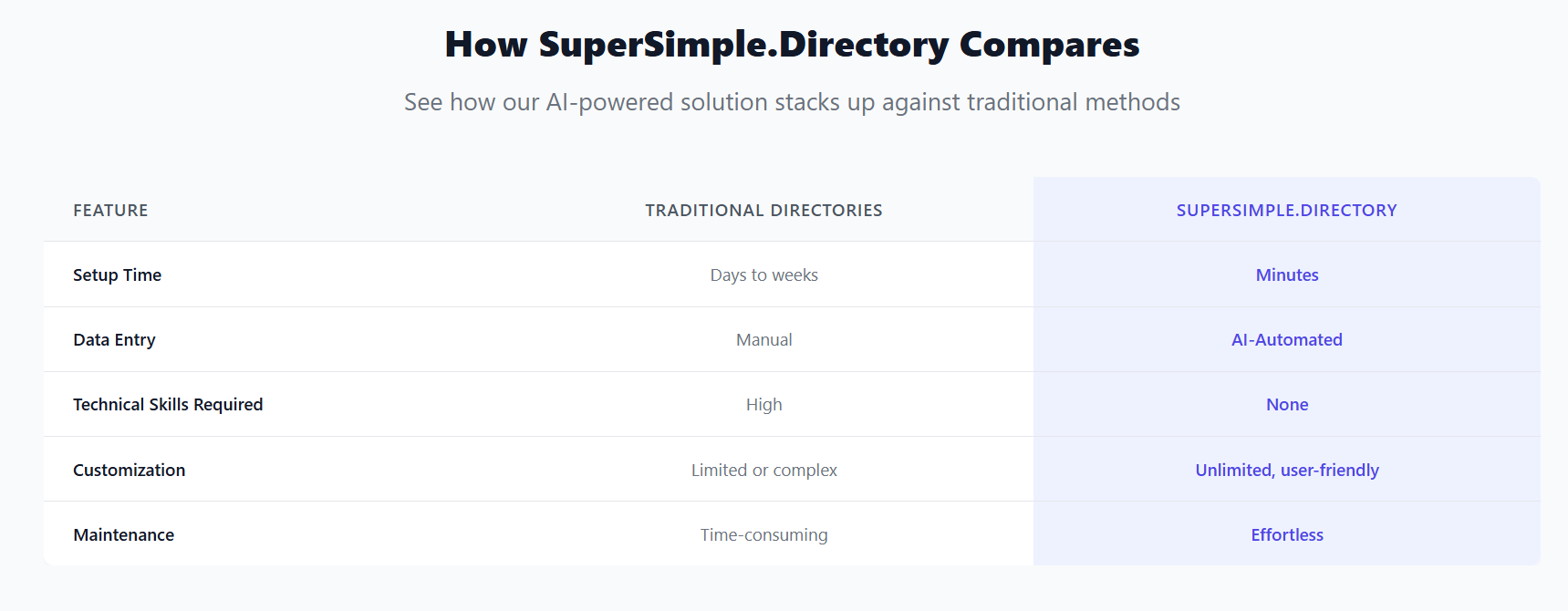 SuperSimple.Directory isn’t trying to replace custom development. It’s trying to eliminate unnecessary complexity for people who want results—not a technical project.