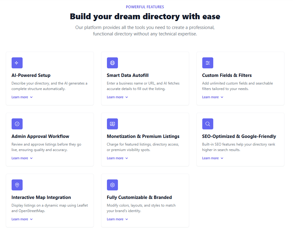 It’s a no-code directory builder that uses AI to generate your directory structure, listing fields, and submission logic based on a plain-English description of your idea. Instead of staring at a blank dashboard, you’re guided into a setup that actually makes sense for search engines and users.